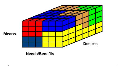 A single cell in the cube represents the intersection of a means-needs/benefits-wants group, and consumers in that cell will be completely described in terms of: (1) Value based purchase behavior, (2) their technology wants and needs, and (3) their revenue potential, and any other attitude/marketing information gathered in the questionnaire.